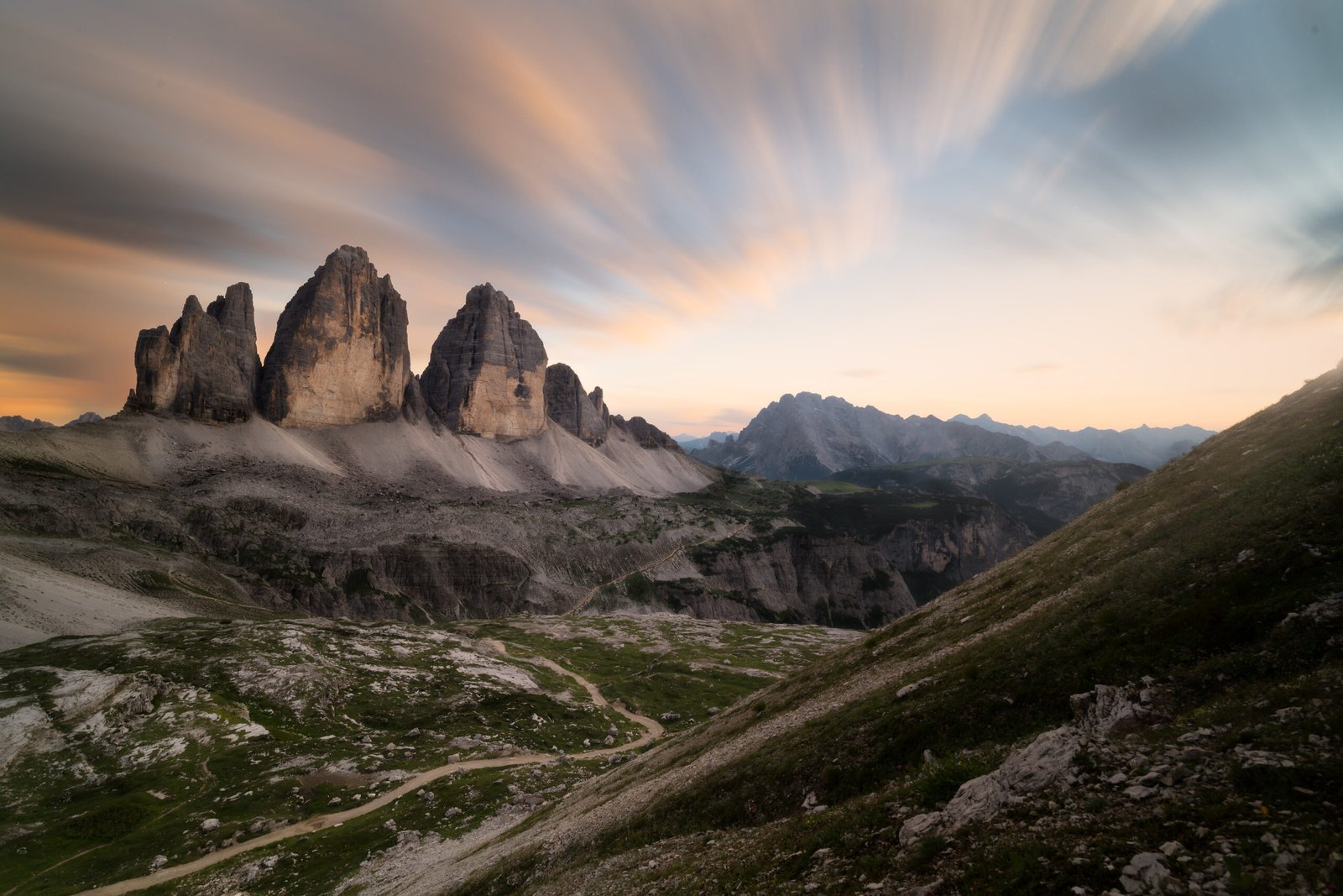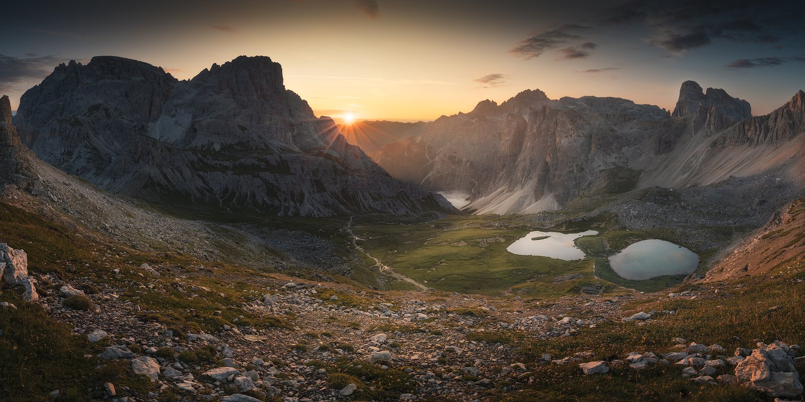 Le Tre Cime all’orizzonte, i laghi dei Piani ai piedi, la torre di Toblin come sentinella. E lì, nel primo respiro del mattino, scattarono in silenzio. La luce si infilava tra le punte come un segreto rivelato solo a chi sa aspettare.
